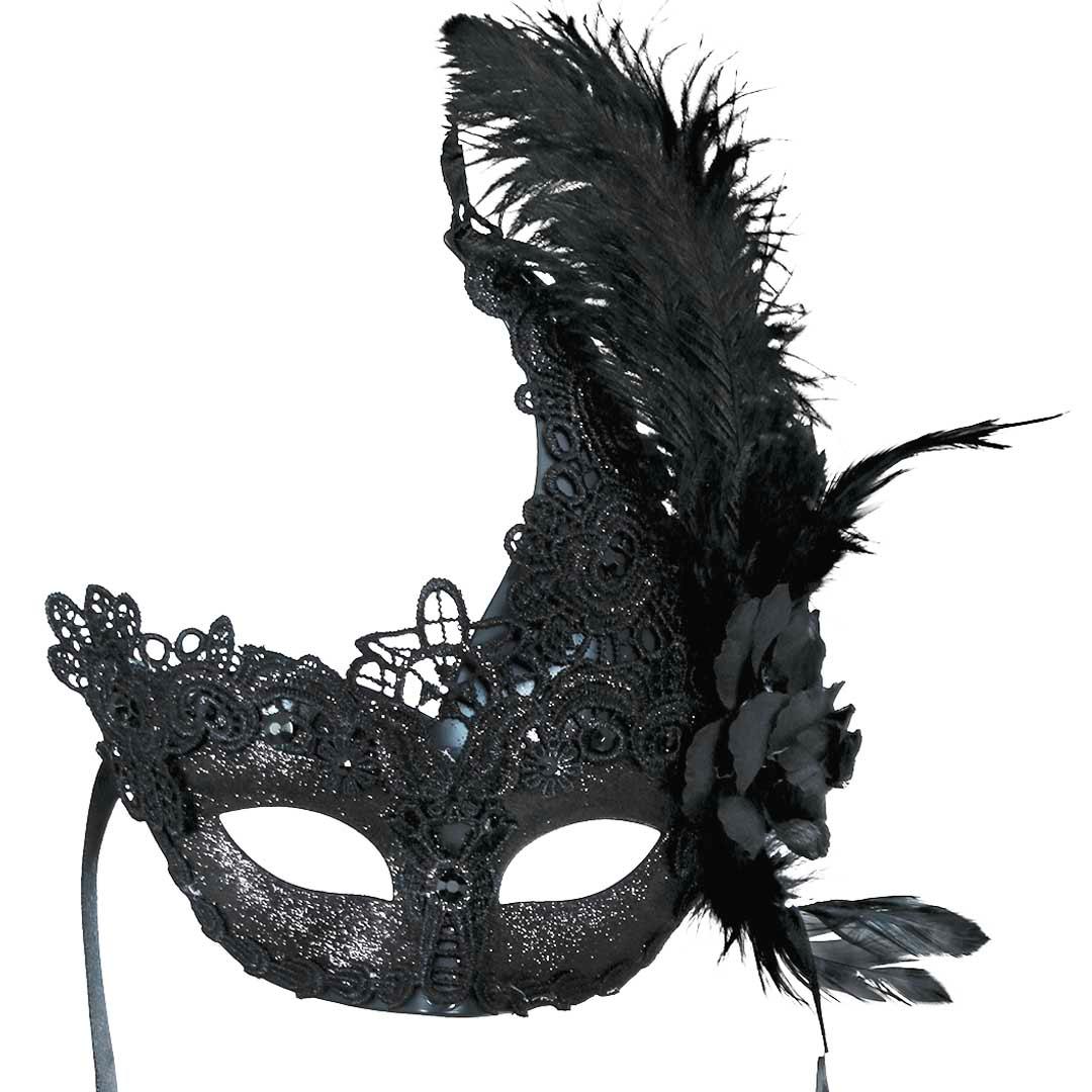 Antifaç amb plomes, bordat i flor de color negre.